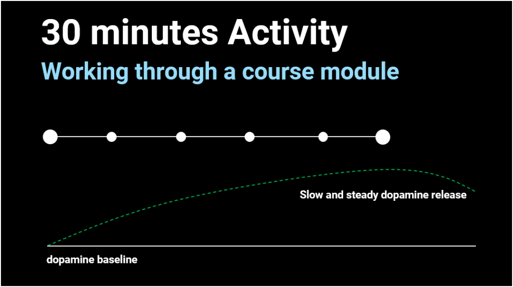 But those 2 activities are rarely separated, one may lead into another. Now let’s put these activities together, let’s say the first activity is writing a piece of code, after I finish I’m feeling pretty good! That’s my system rewarding me with a nice slow dopamine release. Feeling good I decide to reward myself with a scroll through social media…big mistake because now I get a dopamine hit, it boosts up only to come crashing down with a deficit. Now I’ve got to try and get myself motivated again, back to a baseline before I can even begin the next task. It’s hard enough as it is to get going on a task and get that slow dopamine release, now I’ve just interrupted all that good work from earlier. And for what? The digital equivalent of junk food. no nutrition whatsoever.